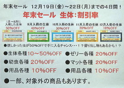 | 10/6 | 天然 対馬産オオクワ、 モセリオウゴン、ババクルビ、ヒペリオン、ドンキエルコクワ、ミクラミヤマ、パリーミヤマ、ラエトゥスミヤ、マザマミヤマ、クラッツオオツノカナブン等 |